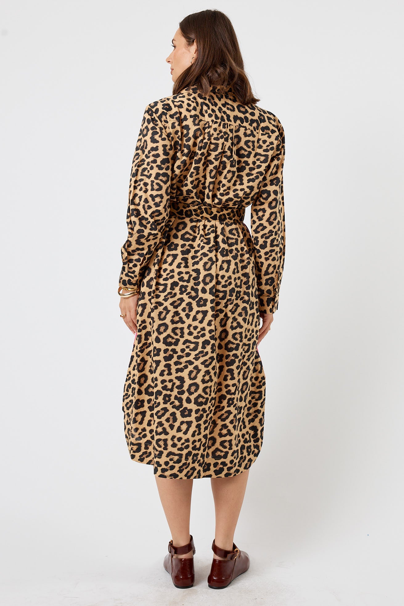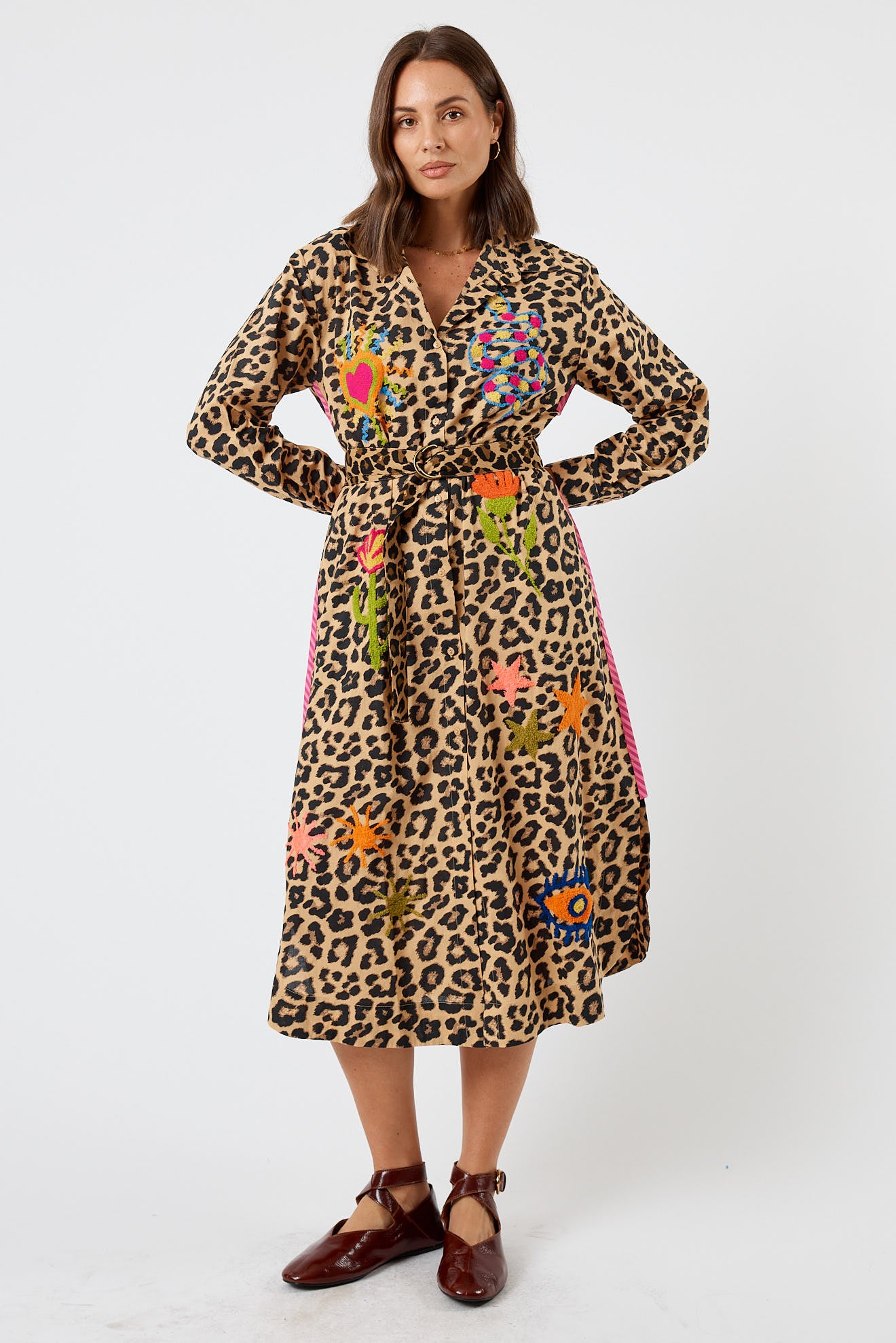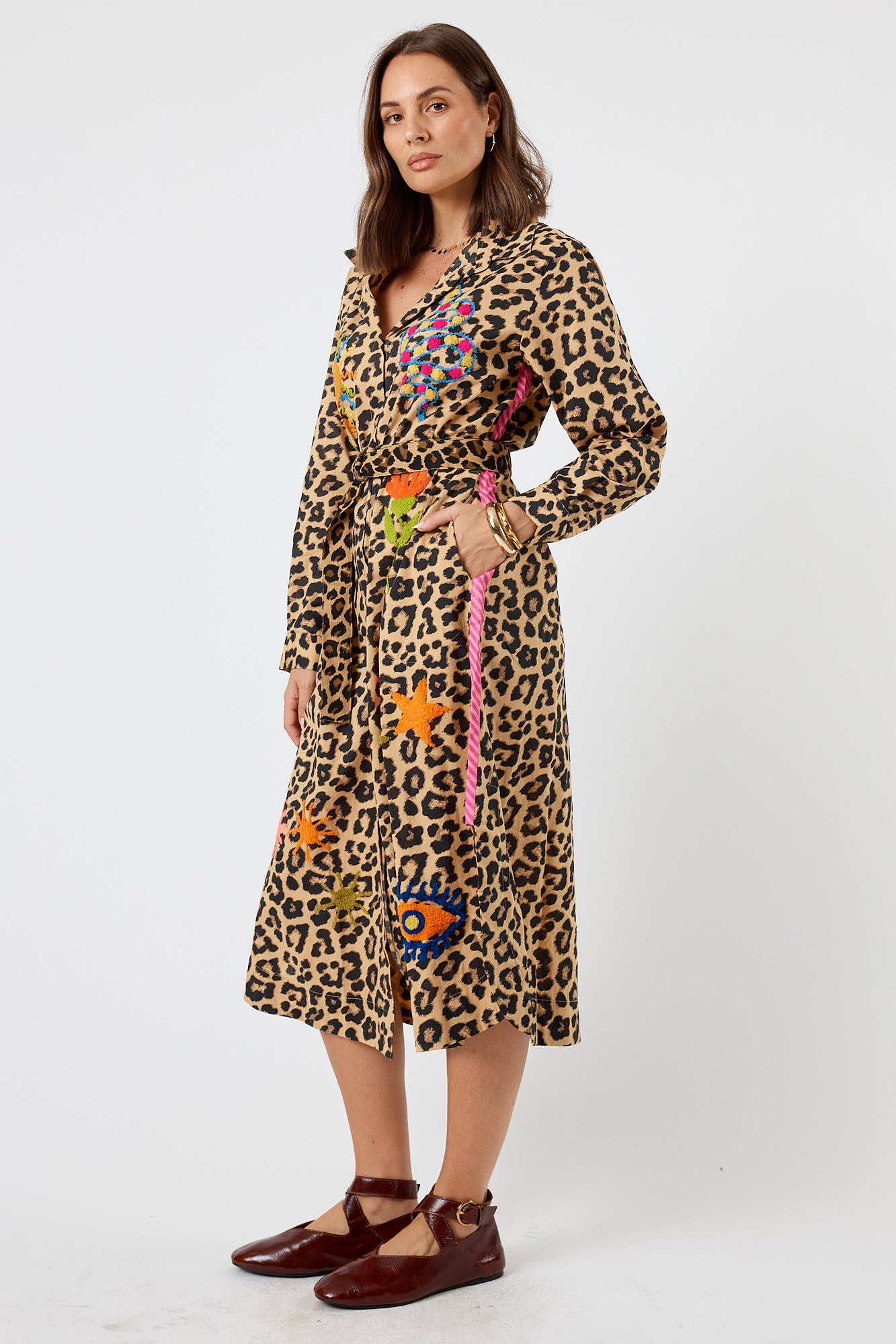 Leopard print meets crisp cotton in a shirt that somehow works with everything else in your wardrobe. This 100% cotton shirtmaker feels cool and breathable on sunny mornings that stretch into big days, with thoughtful details like grosgrain stripe trim and textured embroidered motifs. The adjustable buttoned cuffs and curved hem give it that perfectly undone look, while the D-ring belt lets you switch up the shape. Side pockets and a structured shoulder yoke make it as practical as it is eye-catching.