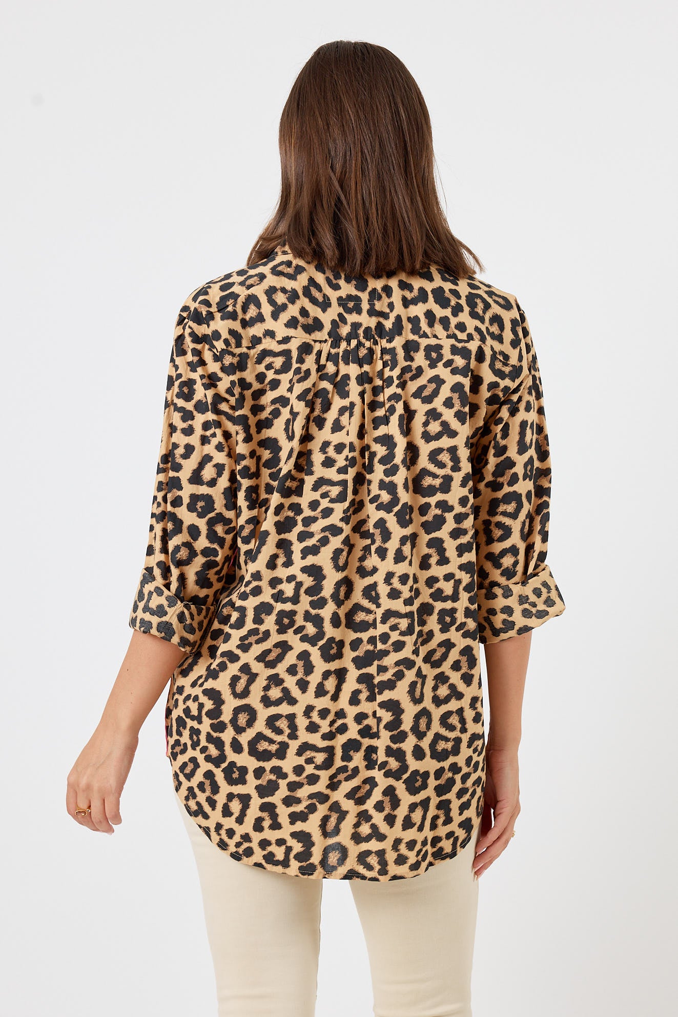 This is the shirt you pack for every trip because it works with literally everything else in your bag. Pure cotton that breathes beautifully, with adjustable cuffs that let you roll up the sleeves when the sun comes out. The leopard print gets a fresh twist with stripe grosgrain braid running down the sides and textured embroidered motifs dancing across the front. Gathers below the shoulder yoke give it just the right amount of shape without being fussy.