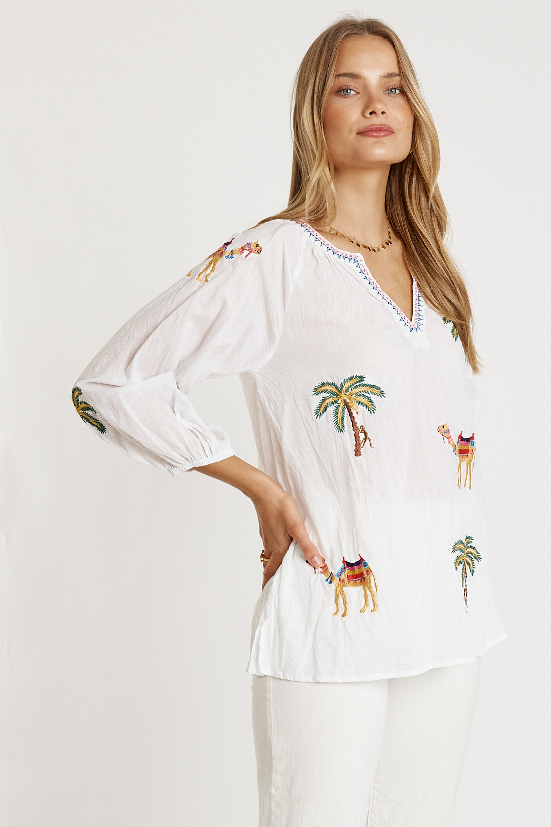 - 3/4 length raglan sleeve with gathers into elastic hem